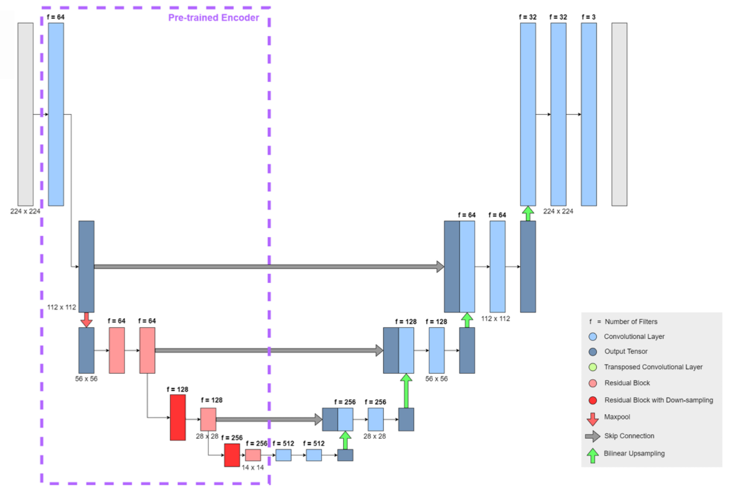 Having implemented a basic U-Net generator architecture, the final step was to substitute the encoder portion of the network with a pre-trained network capable of extracting high-level features. The ResNet-18 model was selected for this purpose, as its size is roughly proportionate to the rest of the network.
