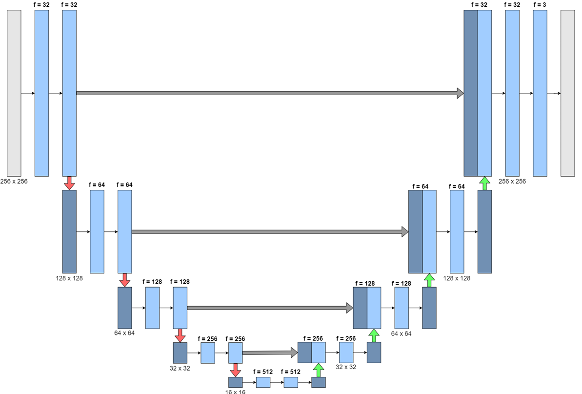 Based on the belief that a pre-trained encoder might improve the network's ability to extract high-level features, the generator architecture was altered to a U-Net structure. This U-Net generator architecture could then be compared against the original CycleGAN generator, before the inclusion of a pre-trained component in the network.